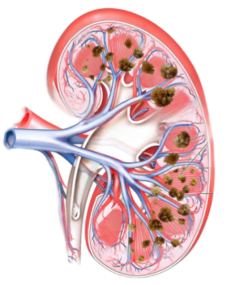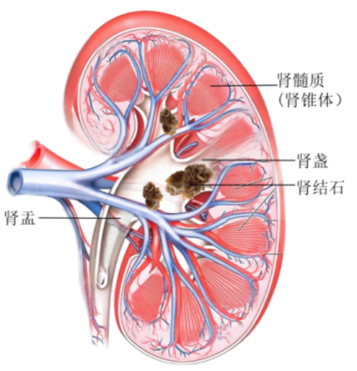 图1 普通肾脏伴肾结石的剖面示意图(结石位于肾盂及肾盏)