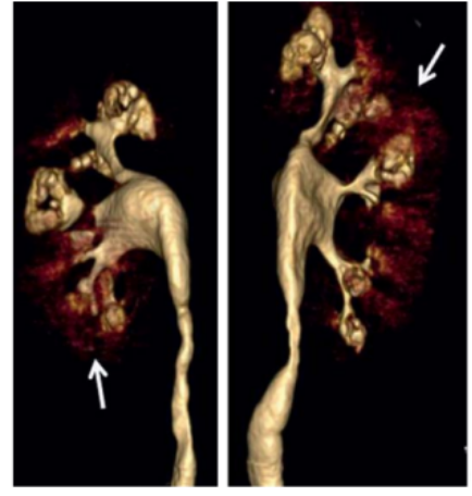 图5 MSK结石的增强CT三维重建,可见囊状扩张的集合管出现标志性的"花簇状"的景观。