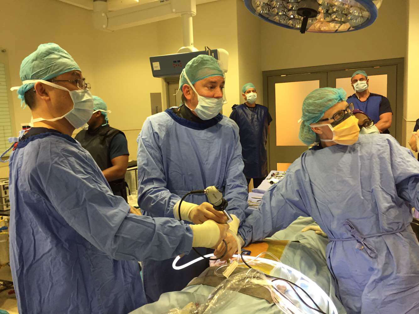 图为北京清华长庚医院泌尿外科李建兴主任在南非演示经皮肾镜手术