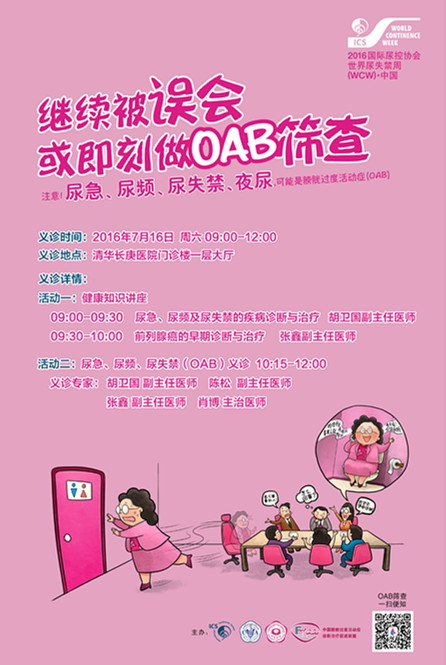 为了在世界范围内提高尿失禁的疾病意识,2009年,国际尿控协会ICS(International Continence Society)发起世界尿失禁周(WCW, World Continence Week),并将每年6月份的最后一周定义为世界尿失禁周,并在此期间进行世界范围内的尿失禁知识推广。