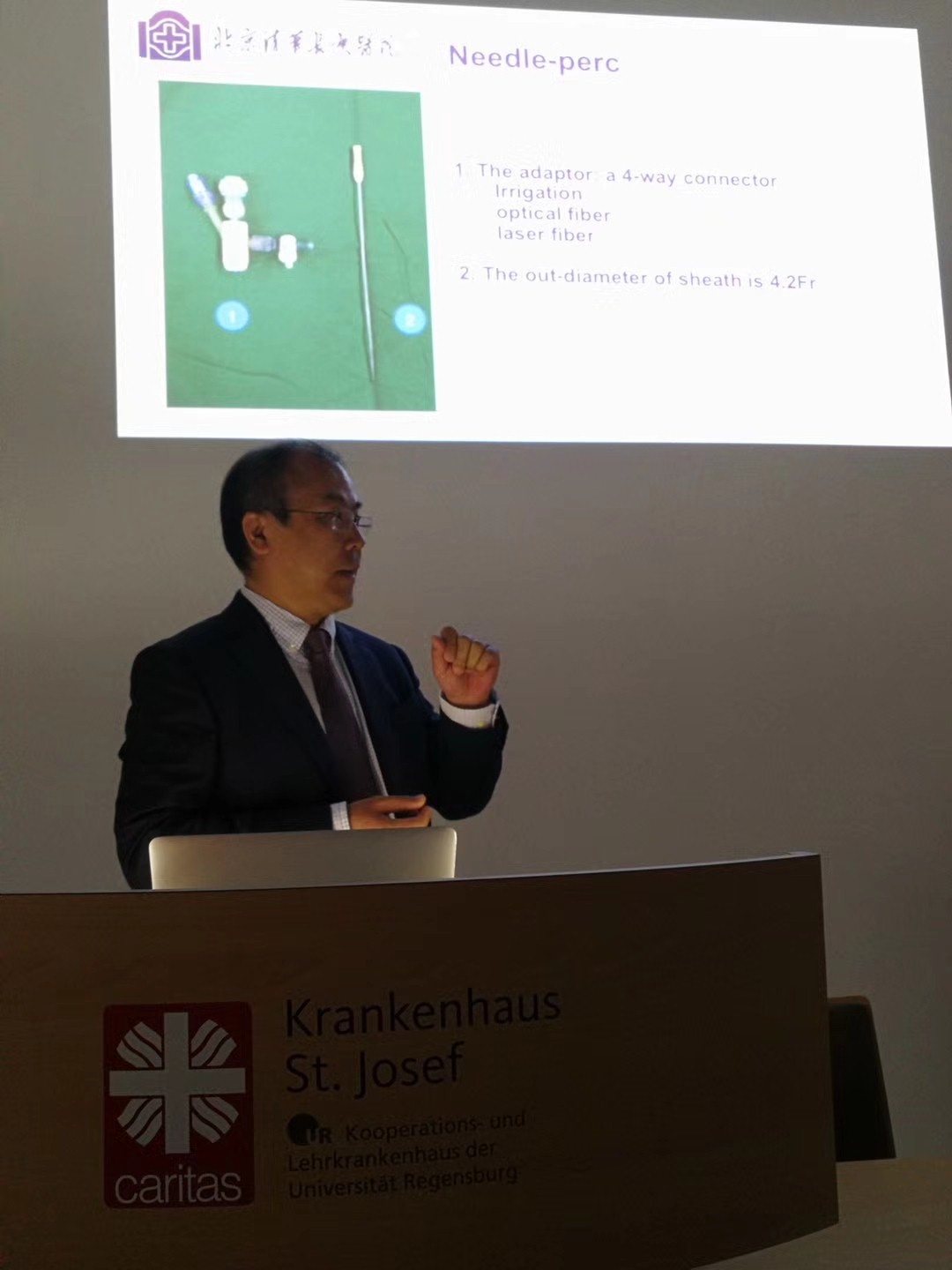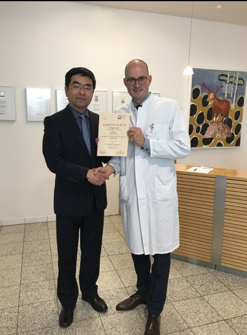 最后一站德国St.Josef Medical Center Regensburg医学中心,李建兴主任再次在学术报告厅做学术报告,介绍超声引导穿刺的中国理念,并重点介绍了创新的中国制造:李建兴主任自主研发的世界最细的4.2F-Needle-perc技术和精准穿刺与超微碎石新理念。双方达成长期学术互访交流意向。胡卫国副主任医师还获得院方颁发的Global Training资格证书。至此德国学术之旅圆满结束。