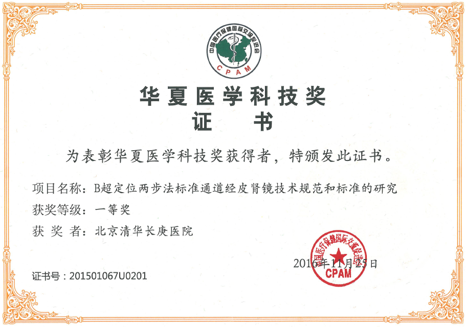 北京清华长庚医院泌尿外科由知名泌尿外科专家、北京市泌尿外科分会副主任委员李建兴教授领衔,以结石治疗为优势,微创为特色,安全有效治疗各类泌尿系结石、肿瘤、感染等疾病,慕名从全国各地前来就诊的大多是疑难复杂尿路结石病人,如合并脊柱畸形、孤立肾、马蹄肾、异位肾、复杂感染、心肺功能不全以及婴幼儿结石等。李建兴教授率先倡导的超声定位经皮肾镜技术具有国际领先水平,是微创手术处理疑难复杂肾结石的技术基础,获得国内外同行认可和推崇。李建兴曾受邀赴德国、美国、意大利、日本、新加坡等多个国家进行教学、展示与推广。因在结石微创治疗领域的杰出成就,李建兴于2017年获选国际性学术组织国际尿石症联盟副主席,并获中华医学会泌尿外科结石领域最高专项奖“钻石奖”。