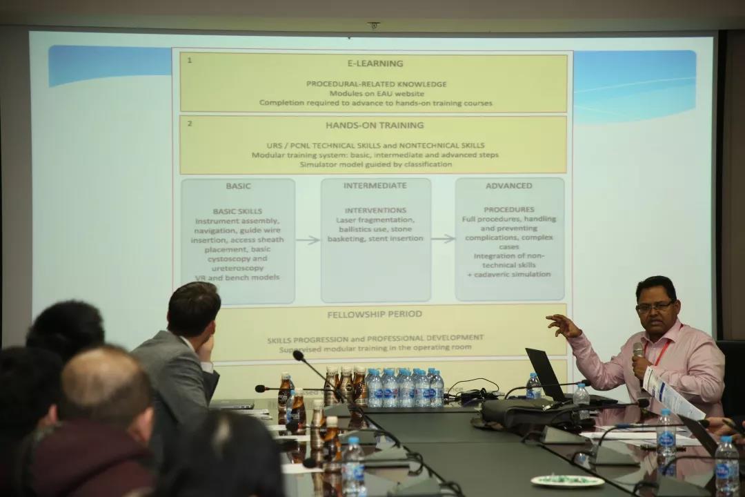 该培训由专题授课和内镜模拟教学两部分组成。授课专家是来自欧洲的Prof.Bhaskar K Somani、Prof. Emanuele Montanari、Prof. Ton Brouwers以及国内的李建兴教授、李凌教授、赵铮教授、胡卫国教授、肖博教授。模拟操作由各位教授以及本院的高年资医师参与指导。
