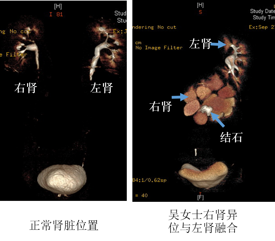 北京清华长庚医院10月18日电 (通讯员 宋海峰)今年51岁的吴女士,3个月前突然感觉自己左侧腰腹部疼痛不适,在当地医院就诊后才知道是患上了肾结石,但棘手的是,她还同时被发现是融合肾,本应位于右侧的肾脏大部分长在了身体的左侧,与左侧肾脏下端融合在一起,完全偏离正常位置,解剖结构极为罕见,而肾结石就以散在、多发的形态位于异位的肾脏内。