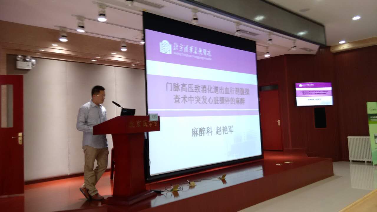 病例讨论由北京清华长庚麻醉科主任张欢教授主持。清华大学第一附属医院北京华信医院、清华大学玉泉医院分别就一例《二、三尖瓣置换术后严重右心衰患者急诊开腹止血》,以及《帕金森患者行脑深部刺激器植入术》的麻醉管理与参会同道进行了探讨。我科赵艳军医生分享了一例《门脉高压致消化道出血行开腹探查术突发心跳骤停》,同与会者在门脉高压伴消化道出血的术前评估重点、术中突发心跳骤停的原因及处理等方面进行了深入讨论及沟通。