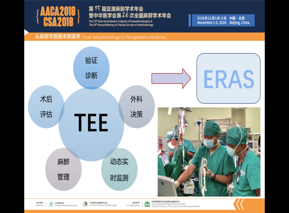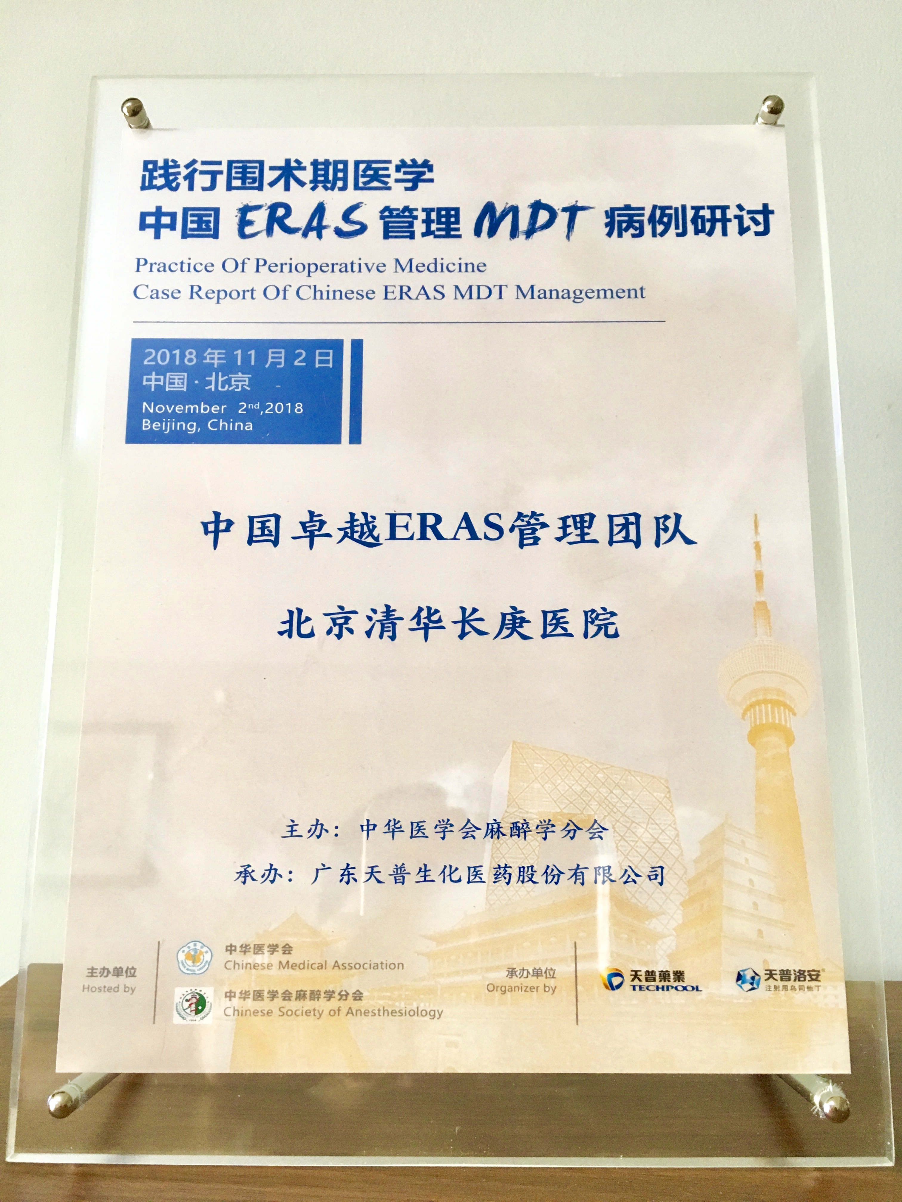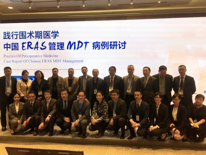 董家鸿院长高度重视此次病例展示,先后三次组织相关人员讨论汇报细节,并专门为病例研讨录制了视频,回顾麻醉学在外科学乃至医学发展中的里程碑作用,阐述麻醉学在加速康复外科(ERAS)中扮演的重要角色,并赋予了ERAS新的解读,即“麻醉医生和外科医生的通力合作才能促成ERAS的实现” (ERAS—Enhanced Recovery achieved by cooperation of Anesthesiologist and Surgeon)。担任本次病例汇报的妇产科张蕾医师、肝胆外科卢倩医师、血管外科吴巍巍医师和麻醉科高志峰医师,凭借出色的演讲技巧征服全场,获得了中国卓越ERAS管理团队的称号。