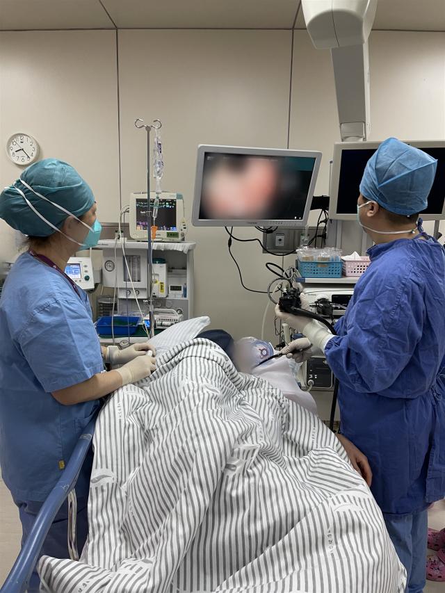 鹉日歌牧乐(左)与唐红卫(右)为患者实施无痛胃镜检查