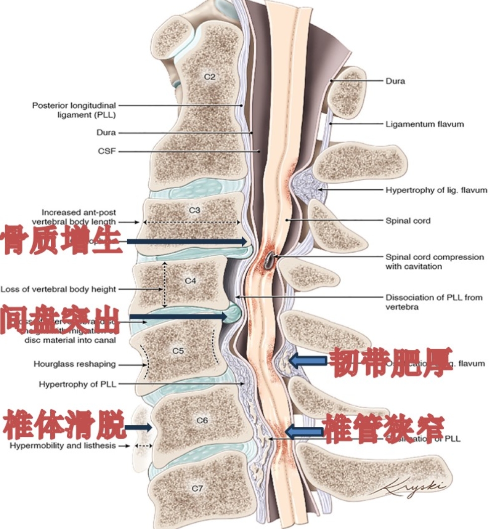 颈椎病的发生本质上与衰老及老化有关,所以又称为颈椎退变性疾病,随着步入中老年,椎间盘就会率先因失水退变而失去弹性,缓冲能力降低,随着椎间盘进一步失水萎缩,脊椎骨之间的高度就会丢失,随后就会塌陷,这个过程会引起颈部一些列病理改变,比如肌肉和韧带的慢性损伤而发生炎症和增生肥厚、关节的应力改变而发生关节炎和骨性增生,而这些继发病理改变所带来的韧带肥厚和骨质增生会压迫脊髓和神经,进而引起麻木、疼痛、无力等症状。