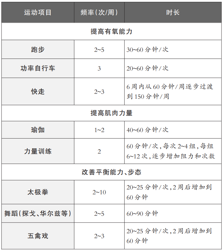 小贴士:帕友可按自身需求选择《帕金森病运动处方专家共识》中推荐的运动(如表格)。
