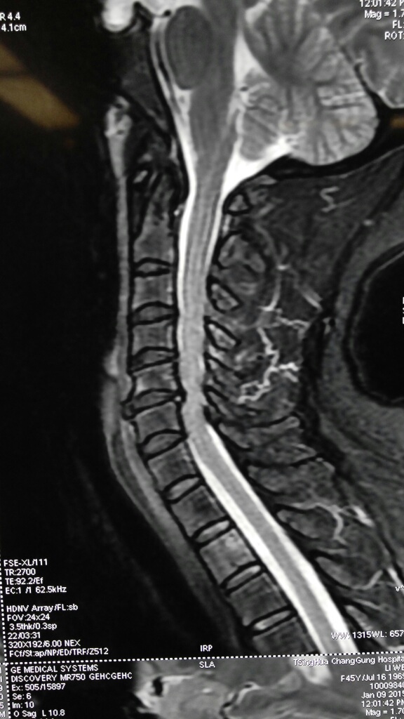 女性,46岁,主因“头晕,双上肢麻木,双下肢无力10余年"入院,颈椎MRI提示颈4-5,5-6,6-7椎间盘突出,5-6节段明显,骨质增生。