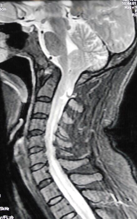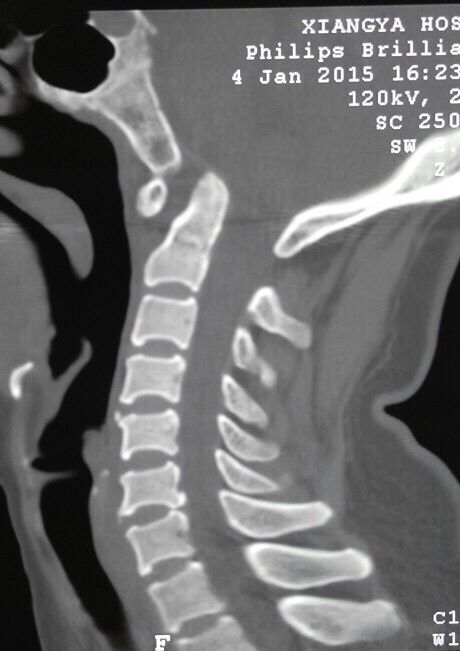 颈椎MRI,CT显示寰枢椎脱位,小脑扁桃体下疝,脊髓空洞