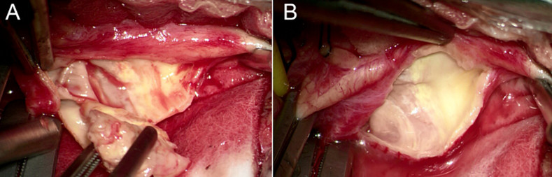 图1.显微镜下剥除颈动脉内膜斑块(A)及剥除斑块后光滑顺畅的管腔(B)