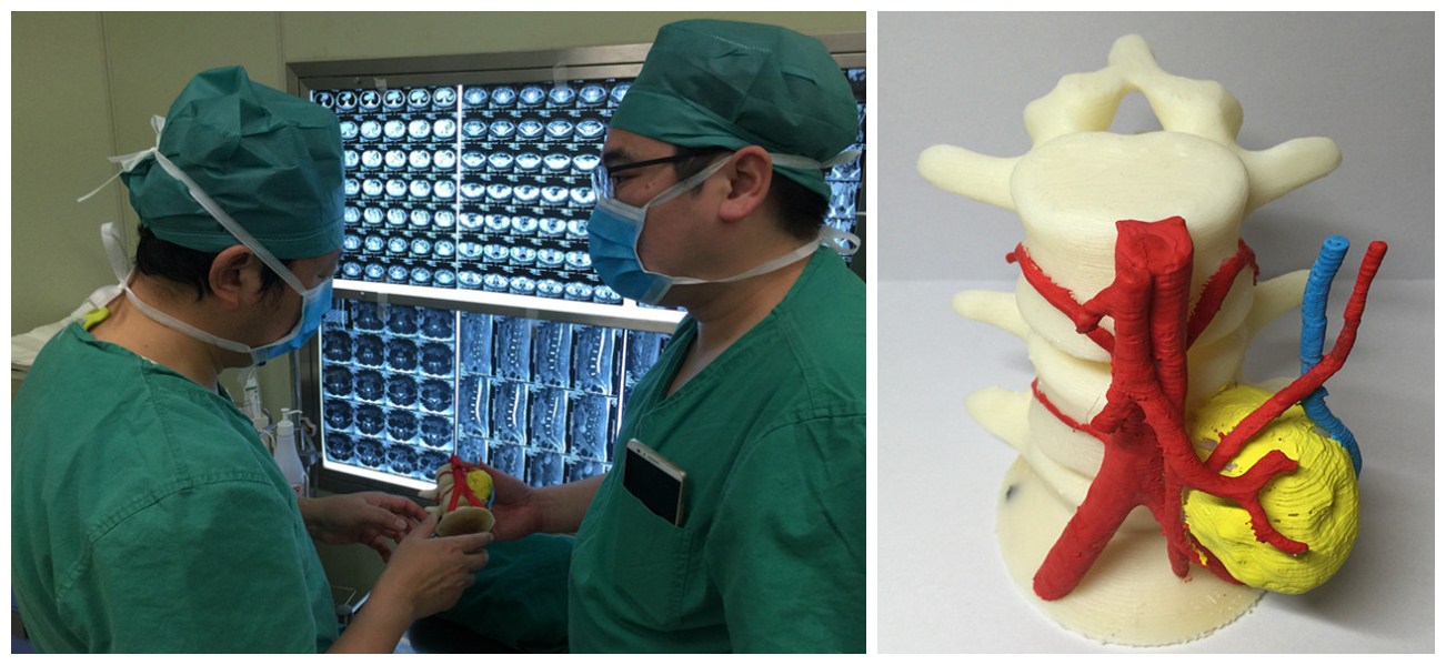 如何能更为精准安全地切除肿瘤呢?这无疑给神经外科团队提出了难题。王贵怀带领神经外科团队多次讨论,希望能够找到更加优化的手术方案。他们决定采用3D打印技术,精准呈现出了病变部位,辅助完成手术设计方案。根据张先生实际情况,结合三维CT及MRI,通过数据软件分析整理,完整地“克隆”出了患者整个病变部位腰椎模型,精准地呈现了患者肿瘤与椎体、血管及输尿管的分布和形态。通过这个模型,神经外科团队拟定了一个更为安全、个性化和精准的手术计划并对其进行模拟实验。术前,王贵怀用“克隆”腰椎,为张先生一家进行了手术方案及风险的介绍,准确的介绍和直观的感受,令张先生减少了很多顾虑。