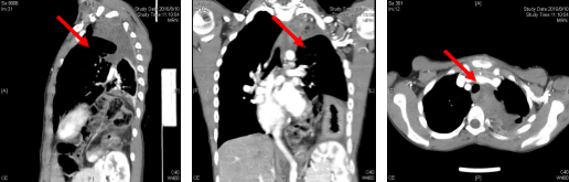 (术前CT评估,“→”表示肿瘤所在区域)