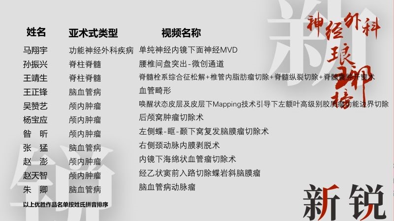 第一届展播秀受到了各省市、各年资、各亚术式神经外科医生的积极响应和热情参与。王劲和王贵怀教授以及孙振兴主治医师分享了神经外科脊柱脊髓疾病领域的手术技术,展示了我院神经外科的良好学科生态和领先优势,扩大了我院神经外科的知名度。