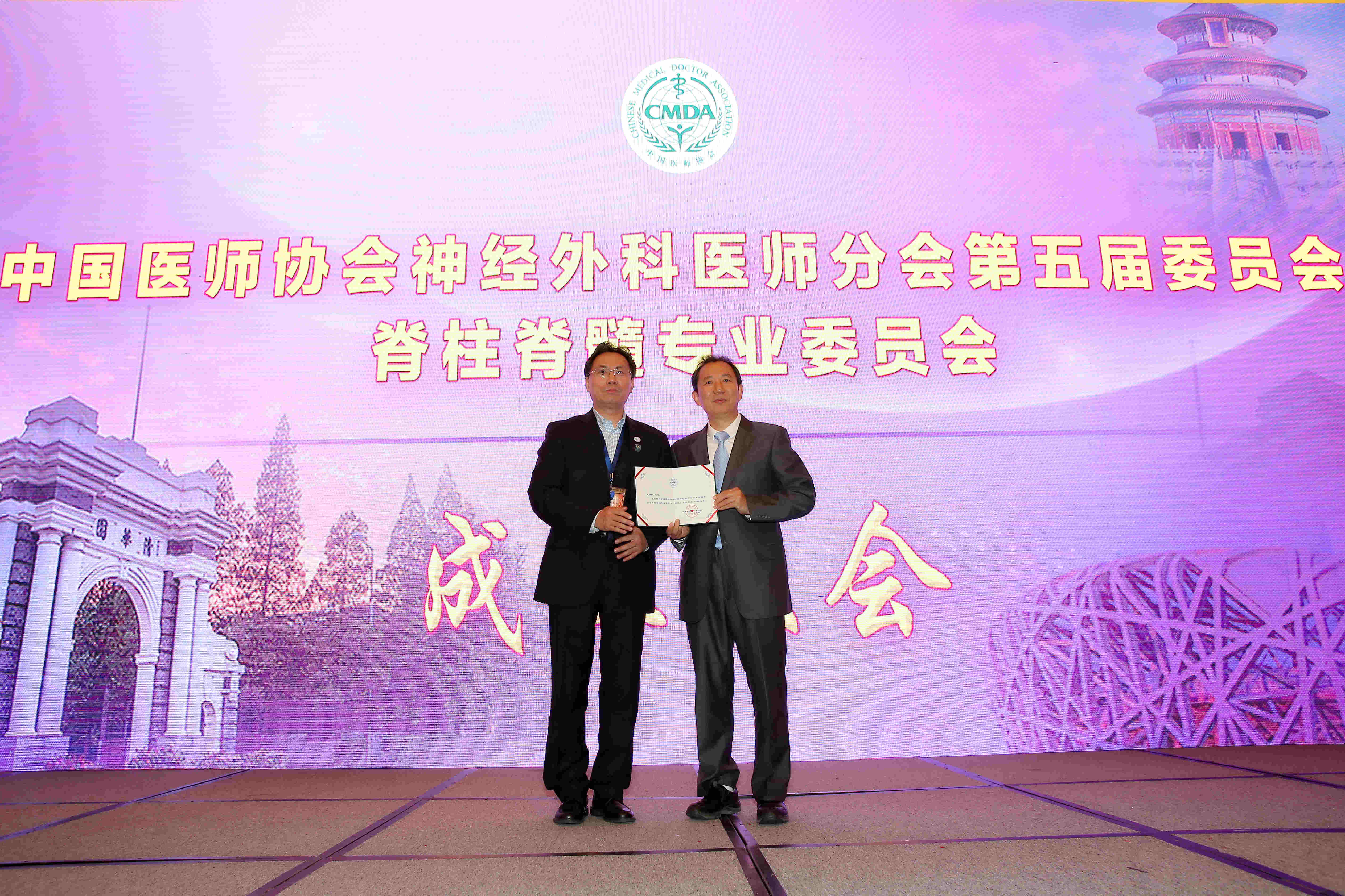 中国医师协会神经外科分会会长张力伟为王贵怀主任颁发了第五届中国医师协会神经外科分会脊柱脊髓学组主任委员证书。中国医师协会神经外科分会秘书长贾旺,北京清华长庚医院党委书记周月红出席。