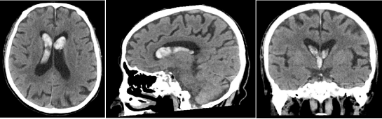 图2 头颅CT提示脑室系统内积血、脑室扩张