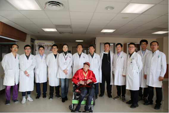 出院那天刘爷爷神采奕奕,穿戴整齐,他胸前抗日战争胜利70周年的勋章格外醒目。神经外科医护人员纷纷和刘爷爷合影留念,记录下了这美好的时刻。北京清华长庚医院神经外科在王劲副院长、王贵怀主任的带领下勇于攀登医学高峰,敢于挑战疑难复杂危重疾患,病人覆盖国内、非洲、加拿大及东南亚地区,今后,神经外科将继续秉持“以病人为中心”的理念,造福更多病患。
