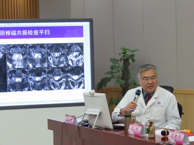 专题发言部分,我科郭毅医师介绍了椎管内外哑铃型神经鞘瘤的治疗,吕宪利医师介绍了脊髓血管畸形的血管造影诊断和血管内栓塞治疗,章薇医师介绍了急性无骨折无脱位型脊髓损伤的救治经验,孙振兴医师介绍了中重度颈椎病显微外科手术治疗病例。会议最后,王贵怀教授作出会议总结并合影留念。