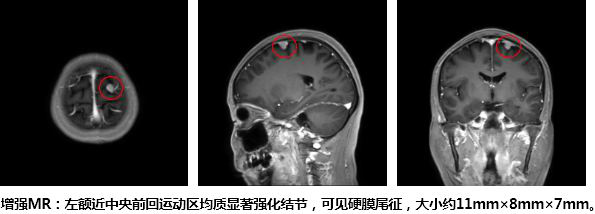 借助机器人手臂的精准与稳定,我院神经外科近期顺利完成了1例在清醒状态下精准微创开颅,切除功能区脑膜瘤的手术。陈女士今年51岁,最近3个多月出现左侧额部的钝痛,头颅磁共振检查发现左额中央前回占位,考虑脑膜瘤可能性大。