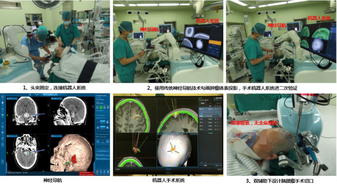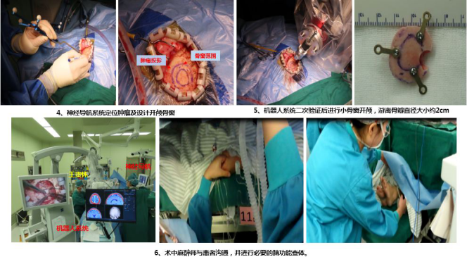 患者病灶微小,病变位于功能区,稍有不慎可能导致患者偏瘫。为了精准微创的完成肿瘤切除,同时保证患者功能不受影响,王劲副院长和王贵怀主任经过严密的术前讨论后,决定为患者进行机器人联合导航的清醒开颅,术中实时与病人沟通,活动手脚,确保神经功能的不受影响。