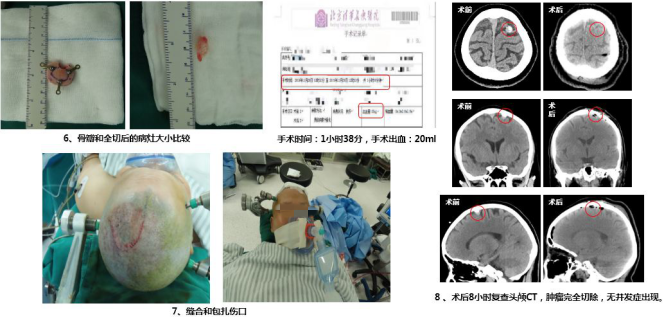 陈女士术后8小时复查头颅CT后提示脑肿瘤完整切除,当天即下地活动,3天后出院,无任何并发症发生和不适,最终病理回报为脑膜瘤,肿瘤得到了根治,术后无需进行放化疗。