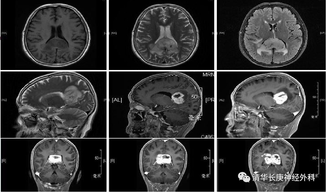 图 2 术前增强MRI 脑深部功能区巨大肿瘤,胼胝体压部,右颞叶内侧巨大异常信号影,恶性胶质瘤可能性大