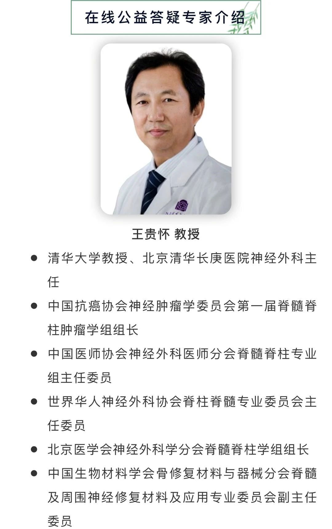 线上义诊内容涵盖“脊髓脊柱肿瘤(神经鞘瘤、脊膜瘤、转移瘤、脂肪血管瘤、星形细胞瘤、室管膜瘤、血管母细胞瘤、畸胎瘤等)、退行性病变(颈、胸、腰椎病,椎管狭窄,椎体滑脱等)、先天性疾病(颅底凹陷、寰枢椎脱位、脊柱侧弯等)、脊髓血管疾病(脊髓动静脉畸形、动静脉瘘等)、脊髓脊柱创伤”等。