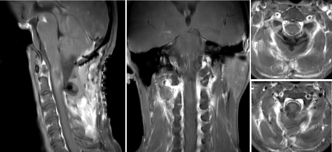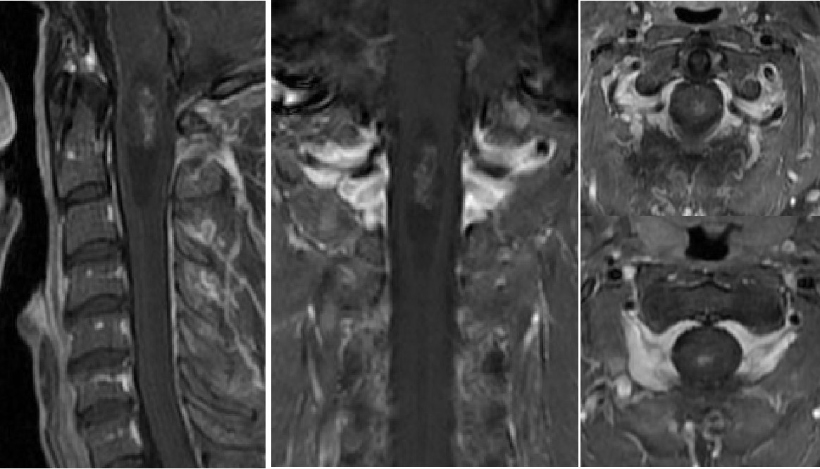 图3 张先生在我院复查的核磁,病变范围从延髓到颈3椎体上缘