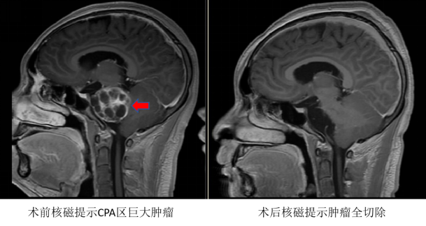 手术历经8小时。术中采用了神经导航、电生理监测、自体血回输等一系列保护措施。术中,正如术前所料,肿瘤血供极为丰富,与脑干粘连紧密,周围结构已经受压变形。而且最为困难的是整个面听神经已经被肿瘤侵犯失去了正常的解剖形态,尽管显微镜下放大将近10倍,辨识这两根神经也极其困难。王贵怀凭借外科策略和显微镜技术,将肿瘤逐步剔除,在最后摘除的那一刻,脑干、小脑以及穿行在此之间的每一条脑神经尽收眼底。
