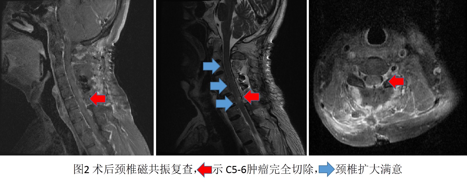 手术视野充分暴露后,王贵怀发现蔡先生体内的肿瘤与常见的脊髓肿瘤不同,病变一半嵌在脊髓内,另一半暴露在脊髓外,属于外生型的脊髓髓内肿瘤。结合多年的临床经验,肿瘤很有可能是良性病变,手术需要在保证神经功能的同时,尽量全切肿瘤。在显微镜高倍放大、超清视野下,王贵怀沿肿瘤周围胶质增生带,仔细剥离肿瘤,确保正常脊髓不受损伤,双极电凝灼烧后分块切除外生部分肿瘤,减轻脊髓压力;然后在显微镜下切除脊髓内肿瘤,实现镜下肿瘤全切除。手术同时为蔡先生进行了椎管扩大成形。术后病理检查证实,蔡先生罹患的是神经鞘瘤,这种脊髓髓内的类型发病率不足万分之一。在后续复查的影像中,肿瘤切除满意,颈椎管空间也得到了很好的扩大。