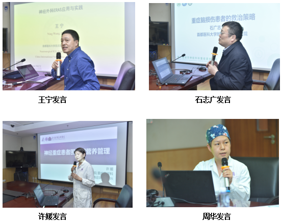 会上,宣武医院王宁教授、北京天坛医院石广志教授、北京清华长庚医院许媛教授、北京清华长庚医院周华教授、北京协和医院魏俊吉教授与大会执行主席郭毅分别就《神经外科ERAS应用与实践》、《重症脑损伤患者的救治策略》、《重症患者的营养管理》、《集束化重症气道管理》、《神经外科重症患者的颅内压管理》、《脑池开放技术在神经外科中的应用》等主题进行发言,并与现场专家进行学术交流。