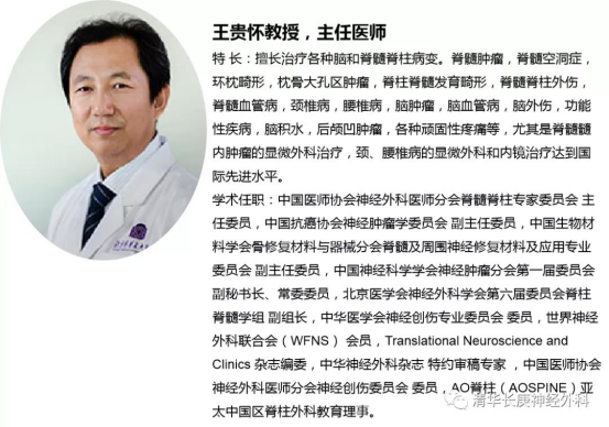王贵怀主任自1994年成为我国神经外科创始人之一的王忠诚院士的学生以来,潜心钻研脊柱脊髓专业近30余年,脊柱脊髓类手术近万余台,其中成功开展高难度脊髓髓内肿瘤手术千余例,治疗效果得到了病人与业内的广泛认可,是国内外在该病治疗最有经验的医生之一。 作为神经中心主任、清华大学博士生导师,王贵怀主任近年来不断加强脊髓肿瘤和脊髓损伤相关研究,为清华大学社会培育了一大批优秀青年科研人才,相关研究成果为病人带去了新的希望。