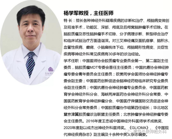 杨学军主任是我国著名颅脑肿瘤专家。原天津医科大学总医院神经外科行政副主任、神经外科教研室主任、脑肿瘤及脑功能病区主任,2021年调任清华大学附属北京清华长庚医院神经外科主任。 杨主任在脑胶质瘤及恶性脑肿瘤手术切除、分子病理诊断、新型综合治疗和临床试验治疗方面造诣深,有30多年的诊治经验。杨学军主任是2021年WHO中枢神经系统肿瘤分类(第五版)的专家解读主要负责人,团队的关于通过靶向抑制转录因子STAT3的磷酸化而抑制免疫检查点分子PD-L1的转录表达等研究,为脑胶质瘤病人的治疗带去了希望。