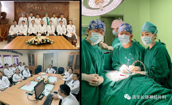 左上:弥漫中线胶质瘤临床诊疗MDT团队;左下:弥漫中线胶质瘤MDT团队 进行讨论;右:王贵怀主任(右二)和章薇副主任医师(右一)为患者进行精准微创手术治疗