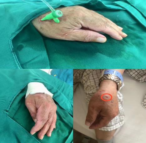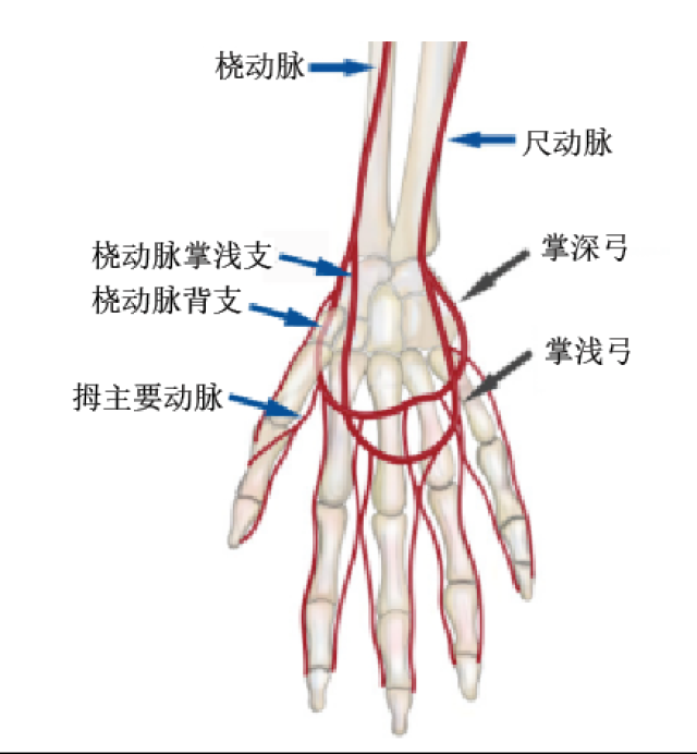 据文献报道,桡动脉入路 (transradial approach, TRA)CAS 技术成功率 83% ~ 91%(右侧颈动脉组为 93% ~ 100%,左侧颈动脉组为 50% ~ 88% ,而牛型弓左侧颈动脉为 80% ~ 88%),平均住院时间为 1.0 ~ 3.5 天。2017 年 Kiemeneij 等首次报道经远端桡动脉入路行冠状动脉介入诊疗的临床研究,证实其安全性及可行性后,经远端桡动脉穿刺入路(图1示例桡动脉掌浅支)引起了广泛的关注。与常规桡动脉穿刺部位相比,经远端桡动脉入路行介入治疗具有更微创、安全、简便的特点,容易压迫止血,入路相关并发症少(例如周围静脉损伤、周围神经损伤及 血肿等),术后患者恢复快,护理方便,接受度高,可以早起下地活动,目前已成为目前神经介入穿刺入路的热点。