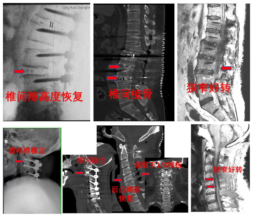完成螺钉植入后,针对颈椎管狭窄,孙振兴再次在显微镜下,使用超声骨刀在椎板上进行上2/3半弧状切除,对脊髓和神经减压,同时保留部分正常椎板骨性结构,防止术后黏连,维持稳定。随后孙振兴再次仔细松解颈椎侧块关节、在颈椎置入螺钉行内固定,矫正后凸畸形的同时加强植骨融合。为尽可能地降低手术创伤,缓解患者双腿疼痛症状,针对患者腰椎管狭窄,孙振兴首先采用了显微镜辅助探查前次术区,去除硬膜外积液和疤痕,切除椎管狭窄的增生骨和韧带,给予神经根充分减压,随后拆除原内植物,打入新内固定螺钉,放入椎间融合器,延长连接棒,完成腰椎减压植骨融合内固定术。历时7小时,手术顺利结束。