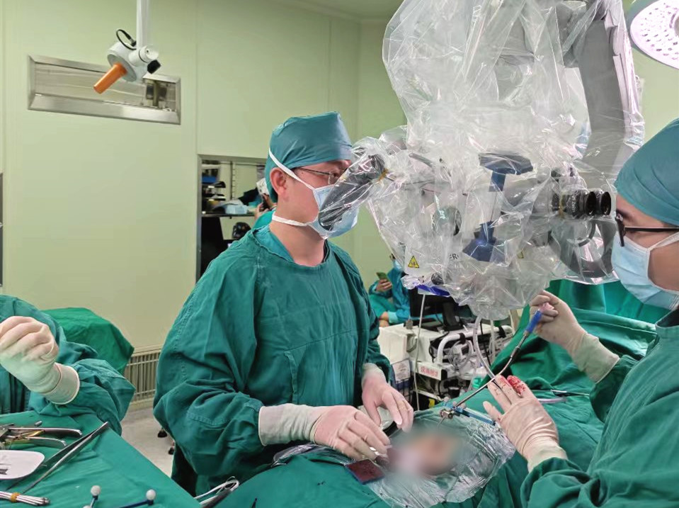 与家属充分沟通后,在神经中心主任王贵怀、知名专家王劲与神经外科主任杨学军的支持与指导下,孙振兴与麻醉科与重症医学科认真评估,为患者制订了“寰枢椎复位椎间融合固定+颈椎板上2/3扩大减压+颈椎后凸畸形矫正植骨融合内固定+腰椎翻修椎管减压植骨融合内固定术”方案。术中,孙振兴主刀,首先对寰枢椎脱位进行处理。显微镜下,孙振兴手持显微器械谨慎游离硬膜囊、神经根、椎动脉与椎旁静脉丛,避免损伤椎动脉、硬膜囊和高位颈髓,显露出颈椎侧块关节,用刮匙与超声骨刀对关节进行塑形,松解出足够空间后,小心在两侧寰枢椎关节间植入3D打印设计的高强度高融合率的同种异体骨骨块,加强复位的同时,减轻螺钉应力,促进骨融合。