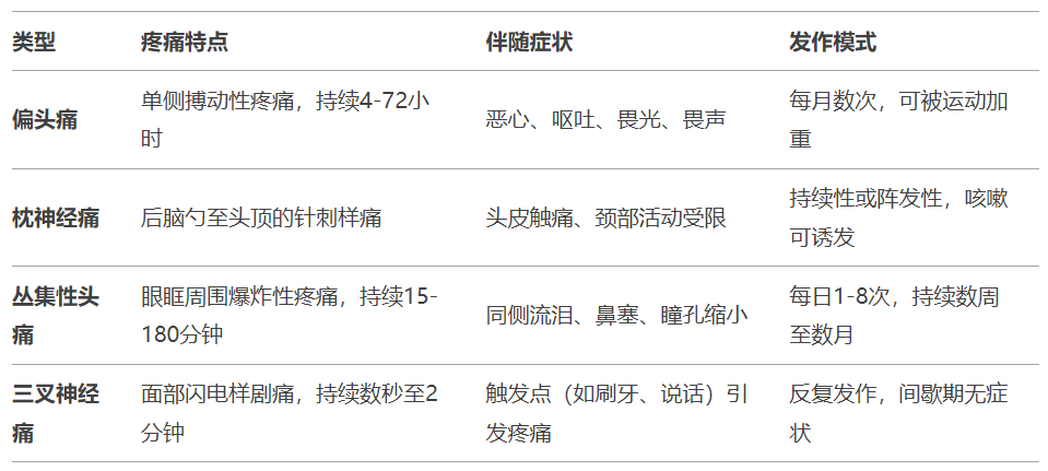 神经性头疼是指因头部或颈部神经结构异常引发的疼痛,其特点是疼痛沿特定神经分布区域放射,常伴随麻木、刺痛,神经性头疼包括:偏头痛、枕神经痛、丛集性头痛及三叉神经痛,其特点各不相同,具体如下图所示。