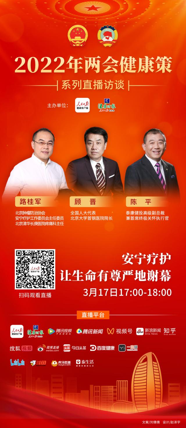 3月17日(周四)17:00-18:00,人民日报健康客户端特别策划的“2022两会健康策”系列直播访谈,邀请到全国人大代表、北京大学首钢医院院长顾晋,北京肿瘤防治协会安宁疗护工作委员会主任委员、北京清华长庚医院疼痛科主任路桂军,泰康健投高级副总裁兼首席终极关怀执行官陈平做客直播间,就“安宁疗护,让生命有尊严地谢幕”话题,分享真知灼见,为两会建言建策。