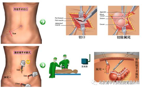 开腹阑尾切除术已有上百年历史,早以是经典成熟的手术。但针对不少肥胖病人及妊娠期阑尾炎或异位阑尾炎的患者并不简单。首先,如果在术中发现阑尾是正常的,因为切口太小,医生很难全面探查腹腔以了解引起腹痛的真正原因。其次,开腹手术切口感染率可达4%~7%,开腹阑尾炎术后肠粘连可导致术后经常腹痛,甚至粘连性肠梗阻,可见传统开腹手术并非尽善尽美。
