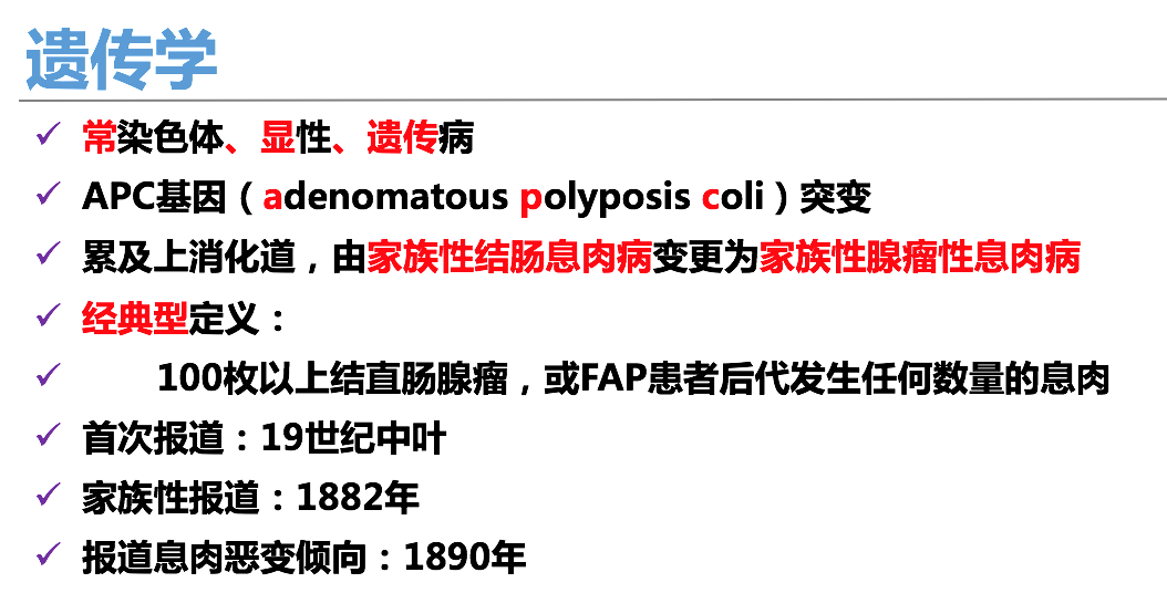 (二)家族性腺瘤性息肉病(又称FAP综合症)为一种遗传性疾病,为多发的、结直肠腺瘤样息肉,病灶类似“蟾蜍皮样”。如不及时诊断治疗,有转化为恶性肿瘤的风险。经过基因检测诊断明确的患者,需在恰当的时机行全结肠切除术,避免癌症的发生。