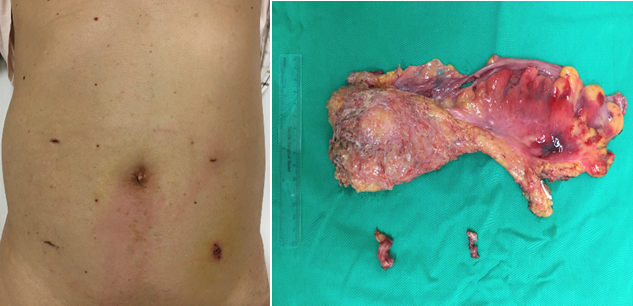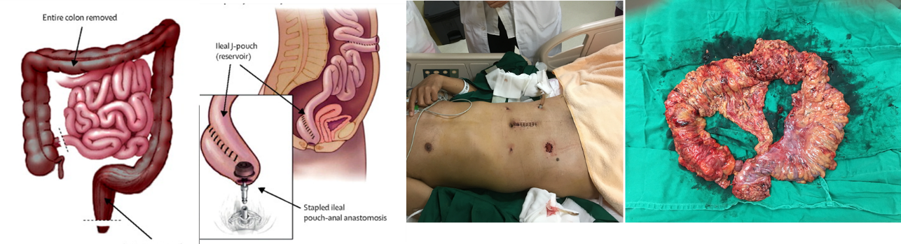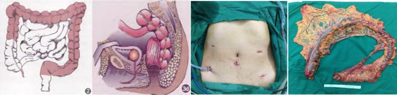 图3:腹腔镜全结肠切除+回肠储袋肛管吻合(IPAA)及手术切除标本