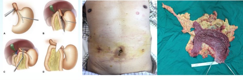 图4:腹腔镜结肠次全切除+升结肠直肠侧侧吻合(NOSES金陵术)及手术切除标本,,切除的结肠次全切除标本经自然腔道取出
