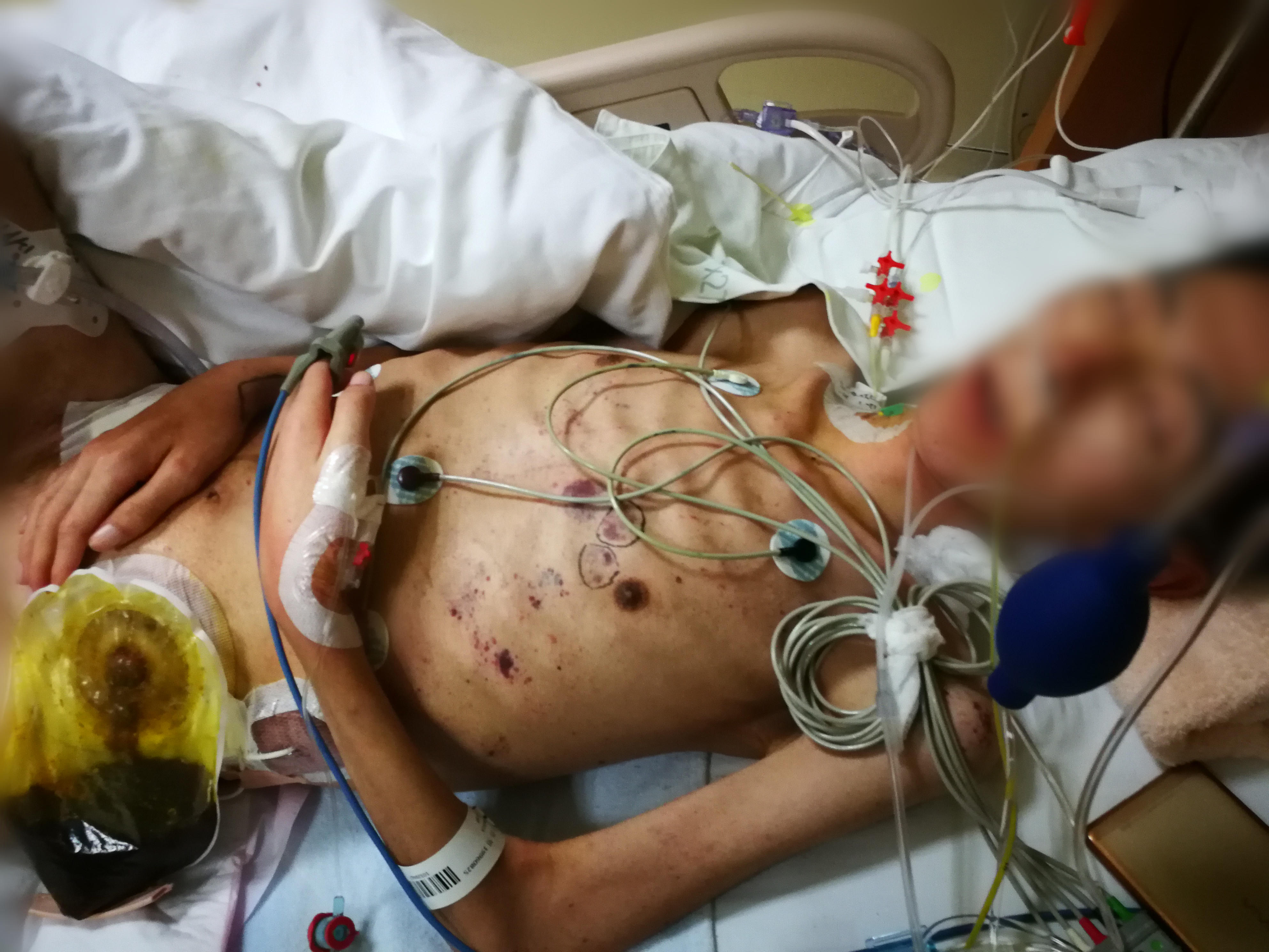 96年出生的小浩是一名大四的学生。2017年底清华长庚医院接诊时,小浩已经处于昏迷状态,呼吸微弱、严重腹胀,全身伴有多个出血点。受胃肠外科主任李元新之托,副主任医师王峰协助家属快速办理住院手续,不到20分钟,小浩已经入住ICU病房。入院诊断为腹腔大量积液、腹腔严重感染、重度营养不良、多脏器功能衰竭,凝血功能障碍,病情极其危重。胃肠外科与重症医学科主任许媛讨论后, ICU主治医生朱研为小浩做了穿刺引流,第一天放出约1500ml脓液,第二天又放出1500 ml,同时进行抗感染和脏器功能支持治疗。在重症医学科团队的努力下,第二天下午,小浩终于恢复意识。醒来后第一眼看见守在床边的母亲,他忍不住哭了,“当时就想着,我活下来了。”