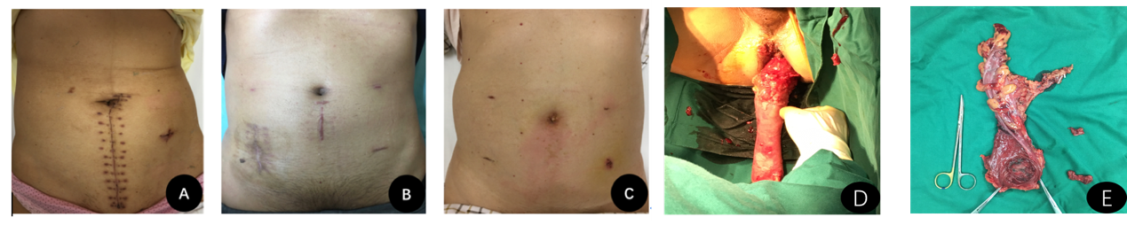 D:术后第5天患者腹壁情况:拔除腹腔引流,恢复饮食