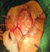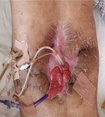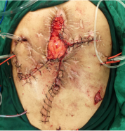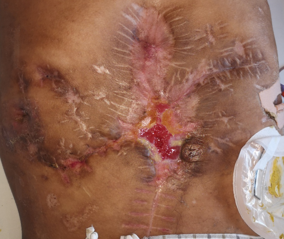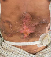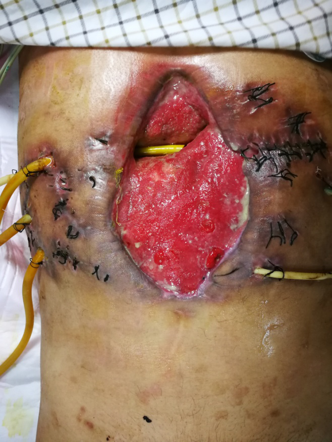 另一手术难点是腹壁重建,因为本病人经历多次手术,两侧腹壁及胸壁瘢痕组织严重,加之多次放置多跟引流管,导致腹壁两侧无法游离及转移皮瓣,导致皮肤无法关闭,李元新主任手术团队再次应用大网膜替代皮肤组织的策略成功关闭患者腹腔,避免了诸多相关并发症的再次发生。