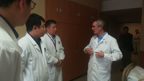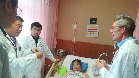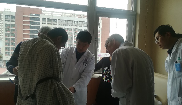 病例讨论后进行重点病人的查房及相关并发症的处理与讨论,双方人员进行合影留念。