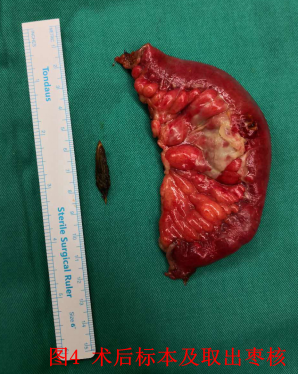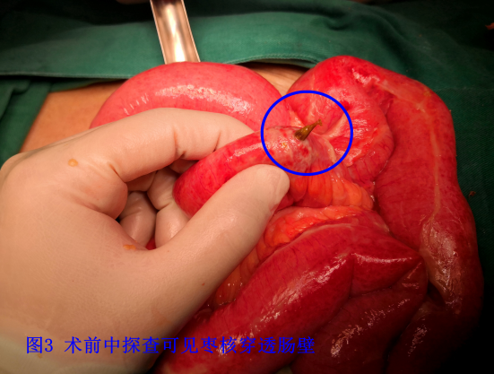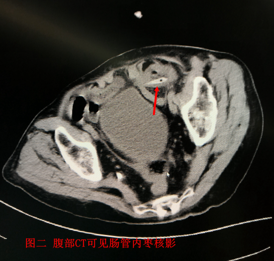 患者:李##,男性,93岁,家住北京昌平天通苑社区,既往患有阿尔兹海默征(俗称“老年痴呆”),无法正常交流。入院前2天出现腹痛、腹胀、恶心、呕吐,自行应用甘油灌肠剂治疗后未见缓解。后出现发热、停止排气排便,就诊于外院,行腹部CT考虑为肠梗阻,给予输液治疗后无效,症状加重,进一步就诊于我院急诊外科,入院时患者神志淡漠,急性痛苦面容,腹部略膨隆,全腹部压痛、反跳痛及肌紧张,患者因不能正常交流,不能描述压痛最重部位。听诊肠鸣音弱。外院腹部CT阅片可见腹腔游离气体,广泛肠道肠壁肿胀,并可见气液平面,考虑为消化道穿孔引起的腹腔感染,并发肠梗阻。血象明显升高(C反应蛋白>200mg/L,白细胞 14.95×10^9/L,中性粒细胞绝对值 12.99×10^9/L,中性粒细胞百分比 87.00%)。因外院腹部CT胶片显示不清,不能明确穿孔部位。急诊复查腹部CT,阅片可见肝周游离气体明确,消化道穿孔诊断明确(见图1)。腹腔内肠管肠壁肿胀,可见多发气液平面,考虑为继发性肠梗阻。除外最常见的胃十二场溃疡穿孔及阑尾穿孔。可见左下腹肠道内“枣核”影(见图2),局部肠管肠壁肿胀最明显明显,并可见少量积液。考虑枣核所致小肠穿孔可能大。追问病史家属确认2天前患者进食大枣粥时不慎将枣核吞咽,根据腹部CT提示枣核影位置,反复腹部查体,通过观察患者表情,确认枣核所在部位为压痛最明显部位。综合患者病史、查体及辅助检查结果,考虑患者为肠道异物(枣核)所致小肠穿孔可能性较大。患者如不紧急实施手术治疗,腹腔感染继续加重,会危及老人生命。但患者超高龄,病程较长,全身状况差。心肺脑等重要脏器功能无法完全评估,且患有老年痴呆,围手术期无法配合治疗,围手术期风险极高。充分向患者家属交待手术的必要性及风险后,患者家属表示理解。急诊行手术治疗,术中探查,因患者既往上腹经腹直肌切口下方可见乙状结肠及大网膜粘连,乙状结肠与盲肠、末端回肠及右肝下方粘连,分离粘连,仔细探查腹腔。胃及十二指肠未见明显异常,结肠未见明显病变,距回盲部约160cm处可见小肠局部大量脓苔,肠壁可见异物(枣核)刺穿肠壁(见图3、4),局部炎症较重,肠壁糜烂,局部腹腔及盆腔可见淡黄色脓液,量约400ml。
