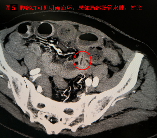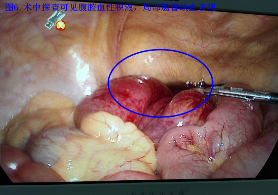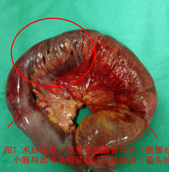 患者韩##,女,93岁,既往冠心病、高血压病史25年余,长期口服药物治疗。患者入院前1天无明显诱因出现下腹部疼痛,为持续性绞痛,阵发性加重,伴有腹胀、恶心、呕吐、停止排气排便。就诊于外院输液治疗后症状未见明显好转。进一步就诊于我院急诊。患者腹部较剧烈,腹部体征相对较轻,完善腹部增强CT后除外肠系膜血管疾病(肠卒中)可能。发现左下腹小肠腹内疝(见图5),并发肠坏死可能。如不急诊行手术可能会发生严重的腹腔感染,危及患者生命。但患者93岁的超高龄,既往有高血压及冠心病等内科疾病,围手术期发生心、脑血管意外及并发心肺肾等功能障碍等风险较年轻患者明显升高。充分向家属交待相关风险,患者家属表示理解。在麻醉科、重症医学科等相关科室的密切配合下当晚急诊行手术治疗。为了进一步明确诊断,行腹腔镜探查,探查见腹腔内大量血性腹水。距左下腹可见局部小肠坏疽缺血水肿(见图6),可见肠系膜根部束带压迫,肠绞窄诊断明确。决定行开腹探查,见距回盲部约40cm处可见部分小肠疝入乙状结肠系膜破损处,疝入小肠约30cm,肠管局部颜色发黑坏死,剪刀剪断肠系膜根部束带及周围粘连,松解疝环。将疝入小肠放回腹腔,温盐水浸泡小肠20分钟,观察局部坏死小肠颜色未见恢复,未见肠蠕动,未触及肠系膜血管搏动。行局部肠管切除(见图7),回肠-回肠顺蠕动侧侧吻合。术后患者入SICU恢复平稳后转回普通病房进一步诊治。给予抗感染、营养支持等治疗。术后患者恢复良好出院。